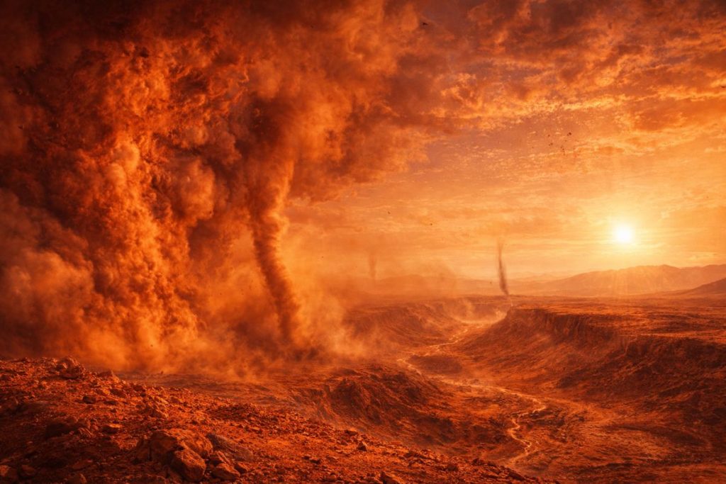 Trotz ihrer geringen Dichte ist die Atmosphäre meteorologisch aktiv. Auf dem Mars gibt es Winde, Staubteufel, Wolken und saisonale Veränderungen. Besonders bekannt sind die Staubstürme, die regional auftreten oder sich sogar über fast den ganzen Planeten ausdehnen können. Solche globalen Staubereignisse können den Mars wochenlang in einen rötlichen Schleier hüllen.