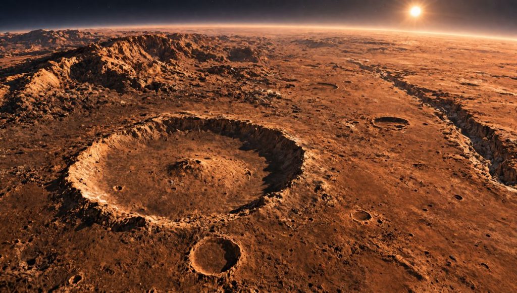 Wie viele feste Himmelskörper im Sonnensystem trägt Mars die Spuren zahlloser Einschläge. Besonders die südlichen Hochländer sind dicht mit Kratern übersät und gehören zu den ältesten Landschaften des Planeten. Diese Gebiete stammen aus einer sehr frühen Phase der Planetengeschichte, als im inneren Sonnensystem noch deutlich mehr Asteroiden und kleinere Himmelskörper unterwegs waren.