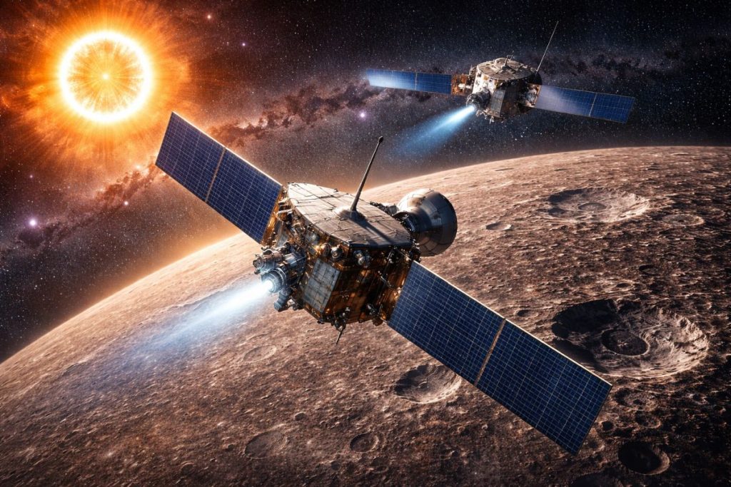 Einen gewaltigen Fortschritt brachte später die NASA-Mission MESSENGER. Die Sonde startete 2004, trat am 18. März 2011 in eine Umlaufbahn um Merkur ein und sammelte dort bis 2015 Daten. MESSENGER kartierte den Planeten wesentlich vollständiger, untersuchte seine chemische Zusammensetzung, bestätigte Eisablagerungen an den Polen, analysierte das Magnetfeld genauer und zeigte, wie komplex die Wechselwirkungen zwischen Oberfläche, Exosphäre und Sonnenwind tatsächlich sind.